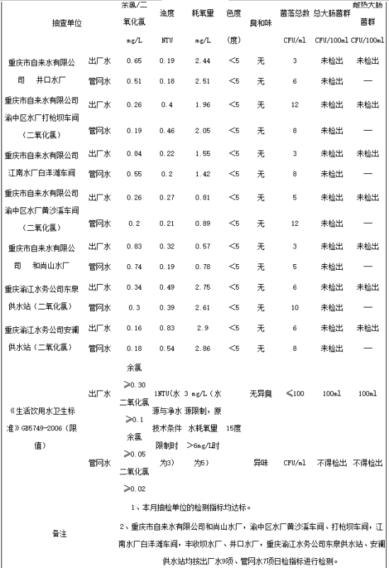 2017年1月,重慶市供水處對我市2家供水企業(yè)的7個水廠進行了水質(zhì)監(jiān)測。結(jié)果表明,本月抽檢單位的檢測指標均達標。重慶市自來水有限公司和尚山水廠,渝中區(qū)水廠黃沙溪車間、打槍壩車間,江南水廠白洋灘車間,豐收壩水廠、井口水廠,重慶渝江水務公司東泉供水站、安瀾供水站均按出廠水9項、管網(wǎng)水7項日檢指標進行檢測。