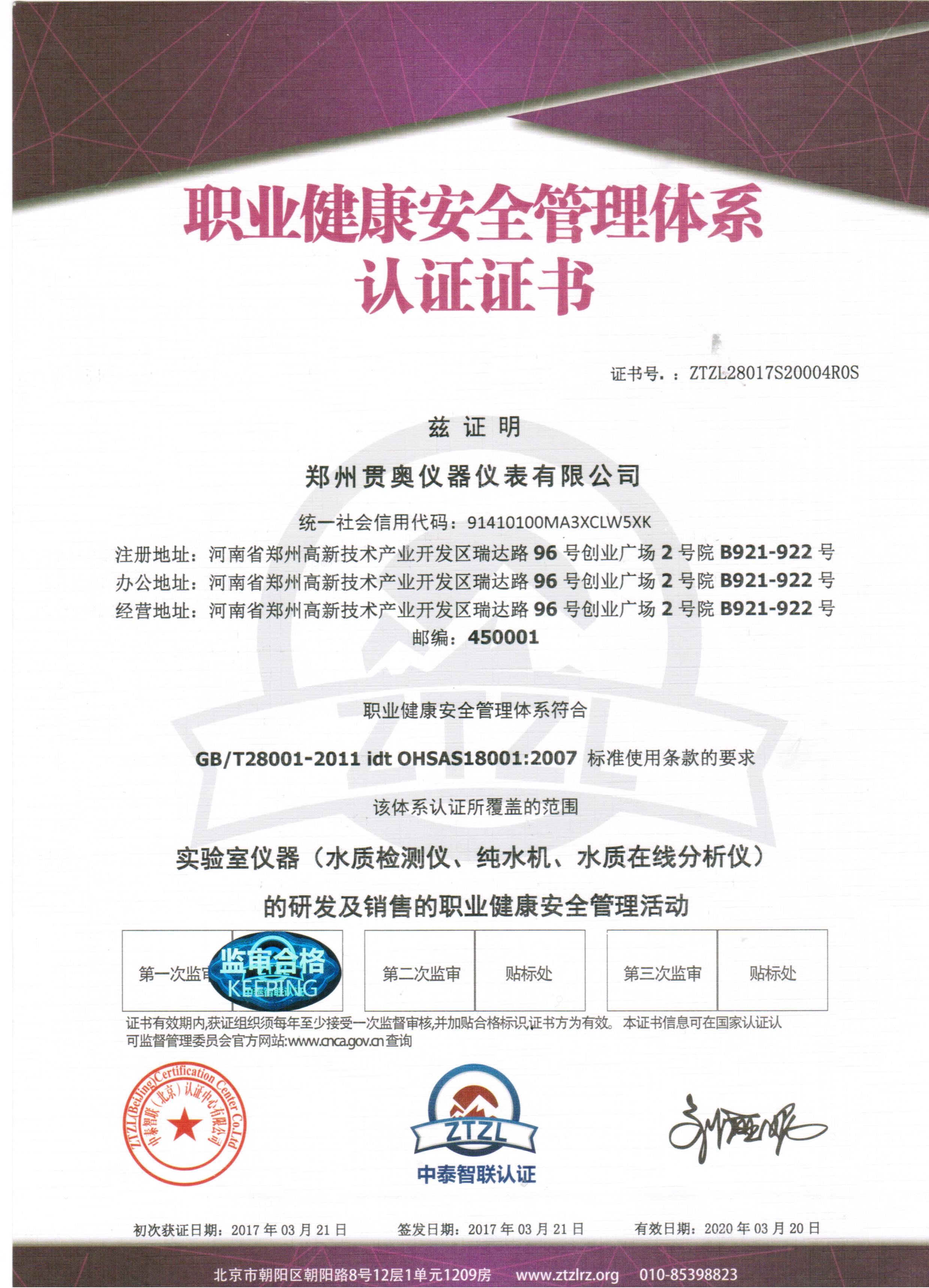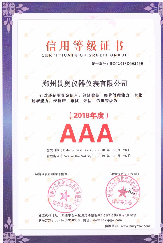 鄭州貫奧儀器儀表有限公司的所有設(shè)備均經(jīng)過省級(jí)計(jì)量院認(rèn)證和檢驗(yàn),貫奧其儀器儀表非常重視知識(shí)產(chǎn)權(quán)的研發(fā)和保護(hù)。公司獲得了"ISO9001:2015"質(zhì)量管理體系認(rèn)證證書,ISO14001:2015環(huán)境管理體系認(rèn)證證書,OHSAS18001:2007職業(yè)健康安全管理體系認(rèn)證證書。鄭州貫奧儀器儀表有限公司企業(yè)信用等級(jí)評(píng)級(jí)"AAA"。