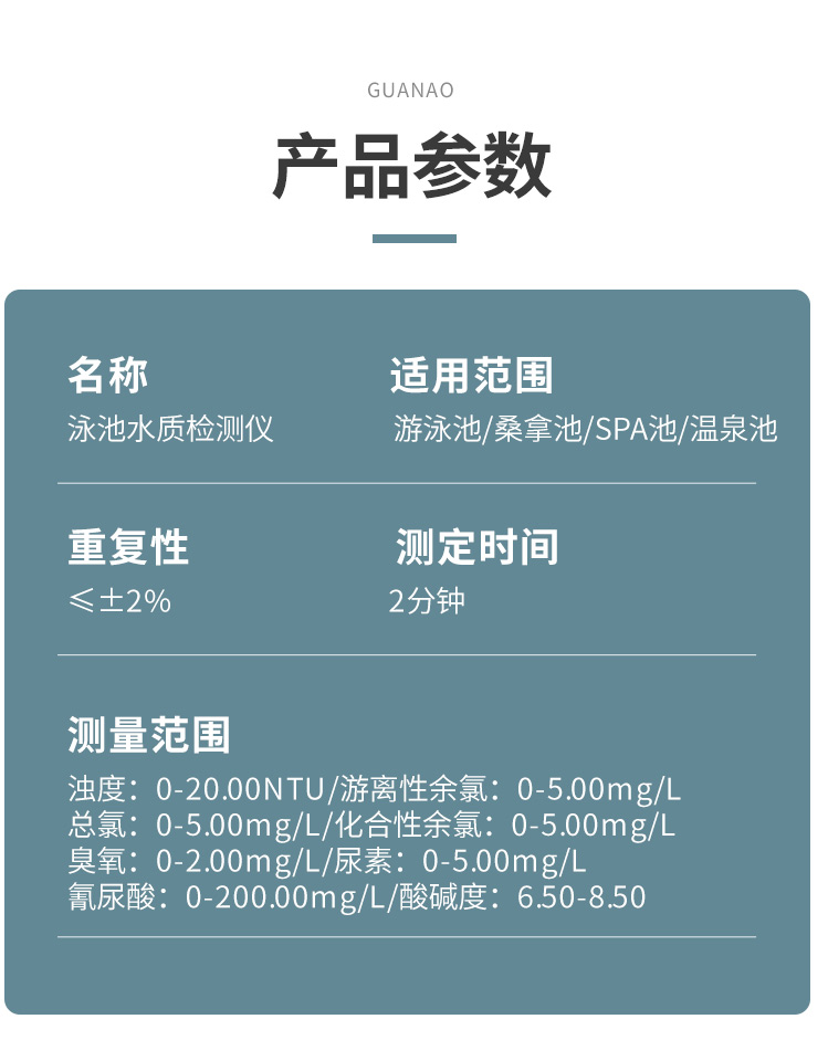4、檢測精準(zhǔn),項目齊全。貫奧泳池水質(zhì)監(jiān)測儀器設(shè)備可檢測12個常規(guī)項目,參數(shù)可自由定制。